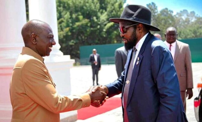 President Williams Ruto of Kenya shakes hands with President Salva Kiir in Nairobi on August 19, 2023 (SS presidency photo)
