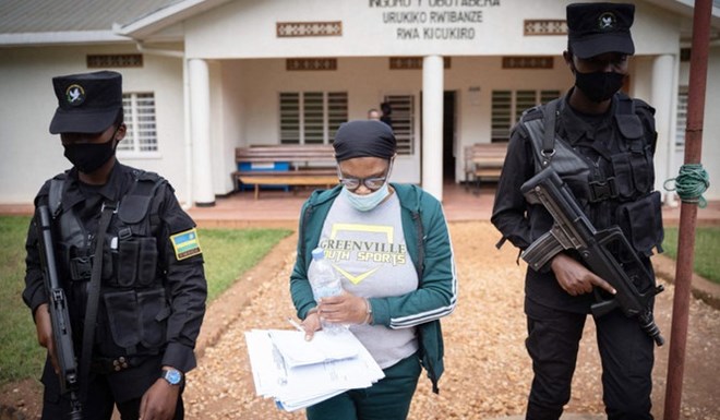 Beatrice Munyenyezi is escorted by police officers at a court in Kigali, Rwanda. (AFP file photo)