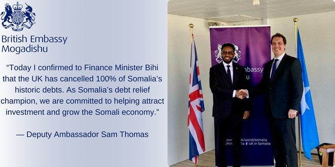 Mogadishu (HOL) – The United Kingdom has fully cancelled Somalia’s historic debt through the completion of the HIPC Initiative, which aims to assist the Horn of the African country in attracting investment, fostering economic growth, and building a secure and stable Somalia.