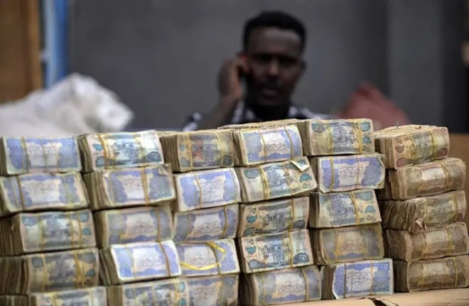 Stacks of Somali shillings are displayed at a currency exchange market in Mogadishu, Somalia, as a trader speaks on the phone. The country’s economy has been struggling with high inflation and unemployment, impacting the livelihoods of many citizens. (AFP/Getty Images)