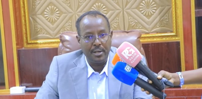 FILE – Nugaal Governor Abdirahman Haji Abshir (Qaanqaa) addresses the media during a press conference in Garowe, Puntland, on security measures being implemented in response to recent threats.