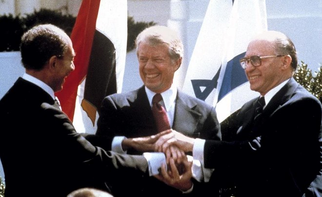 Egyptian president Anwar Sadat, US president Jimmy Carter, center, and Israeli prime minister Menachem Begin clasp hands on the north lawn of the White House as they sign the peace treaty between Egypt and Israel, March 26, 1979. (AP/Bob Daugherty)