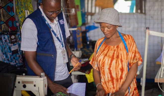 Adelle Mubalama, right, a tailor with a shop at Kenya’s Kakuma refugee camp, was able to launch a business when she got a loan from Inkomoto. The organization helps small business entrepreneurs. (Photo courtesy of Inkomoto)