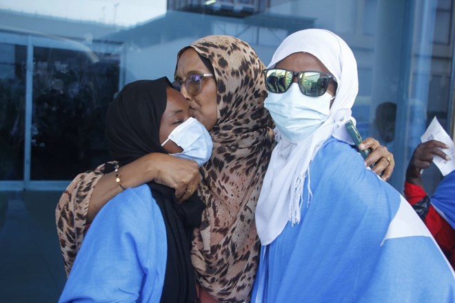 The survivors aged 17 to 50 wore outfits made of fabric with the Somali national flag colors as they disembarked from a plane in the capital, Mogadishu, visibly relieved to return to safety.