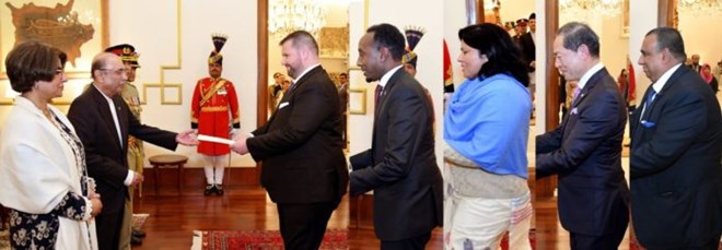 Ambassadors from Romania, Somalia, Nepal, Japan, and Bangladesh presented their diplomatic credentials to President Asif Ali Zardari during a ceremony held at Aiwan-e-Sadr today.