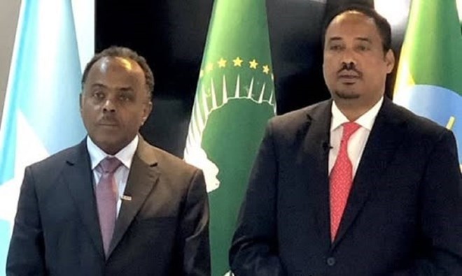 FILE – Somalia’s State Minister for Foreign Affairs, Ali Mohamed Omar (left), and Ethiopia’s State Minister for Foreign Affairs, Ambassador Misganu Arga (right), pose together during high-level talks in Addis Ababa aimed at advancing agreements reached during the Ankara Summit. The meeting focused on strengthening bilateral ties and addressing key regional issues.