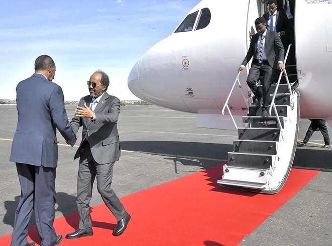 Mogadishu (HOL) — Somalia’s President Hassan Sheikh Mohamud arrived in Asmara on Wednesday for bilateral talks with Eritrean President Isaias Afwerki, marking his fourth visit in six months.