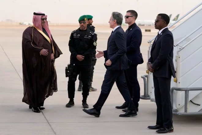 U.S. Secretary of State Antony Blinken is welcomed upon arriving at King Khalid International Airport, in Riyadh, Saudi Arabia, Monday, Feb. 5, 2024. Mark Schiefelbein/Pool via REUTERS Acquire Licensing Rights