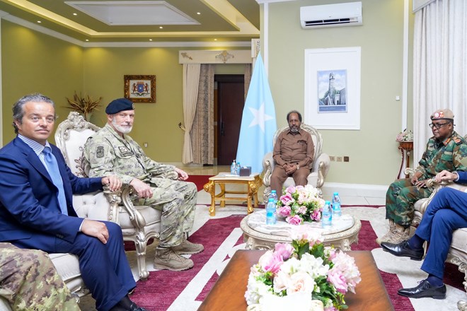 Mogadishu (HOL) – President Hassan Sheikh Mohamud met with Admiral Giuseppe Cavo Dragone, Chief of Defense Staff of Italy, in Mogadishu on Tuesday. The leaders said the meeting was a major step toward strengthening security cooperation between the two countries. Part of an ongoing series of high-level talks aimed at improving bilateral ties, the engagement is centred on the combined fight against terrorism and strengthening Somalia’s security apparatus.