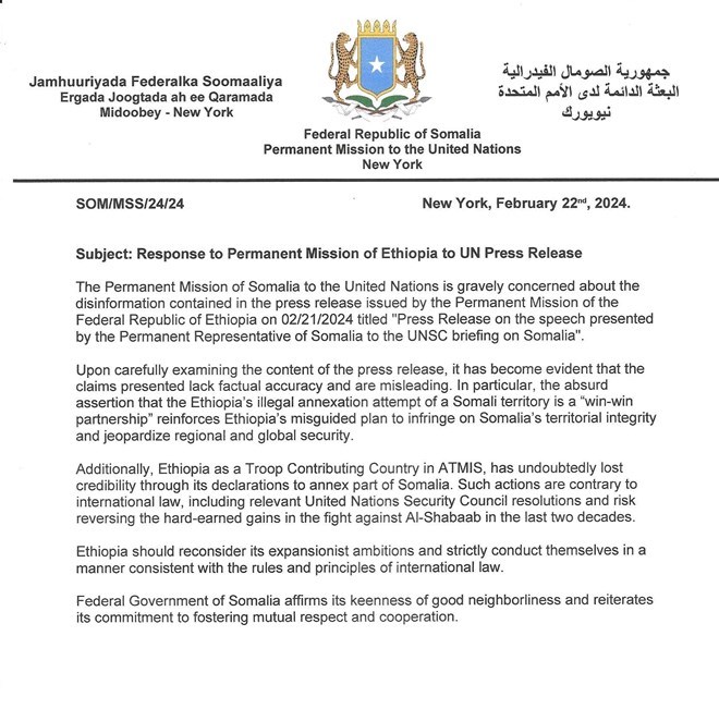 Somalia’s envoy reiterated, “The severity and implications of Ethiopia’s actions, particularly emphasizing Ethiopia’s instrumental role in providing troops to the African Union Mission in Somalia (AMISOM).” The envoy emphasized “The stark contradiction between Ethiopia’s actions and the established legal framework, including resolutions from the United Nations Security Council, which could potentially unravel the painstaking progress made in combating Al-Shabaab over the past two decades.”