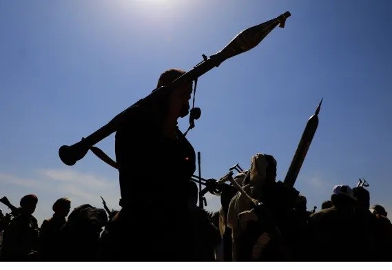 Armed supporters of Yemen’s Houthi rebels attend a rally in solidarity with the Palestinian Hamas group in the Yemeni capital Sanaa, January 29, 2024 [Mohammed Huwais/AFP]