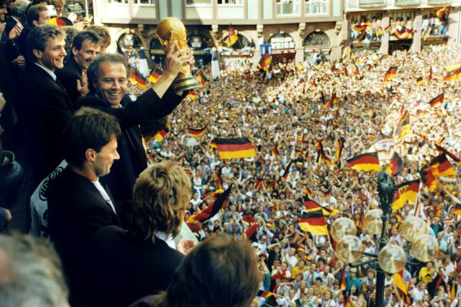 Beckenbauer celebrates with the World Cup trophy in 1990.