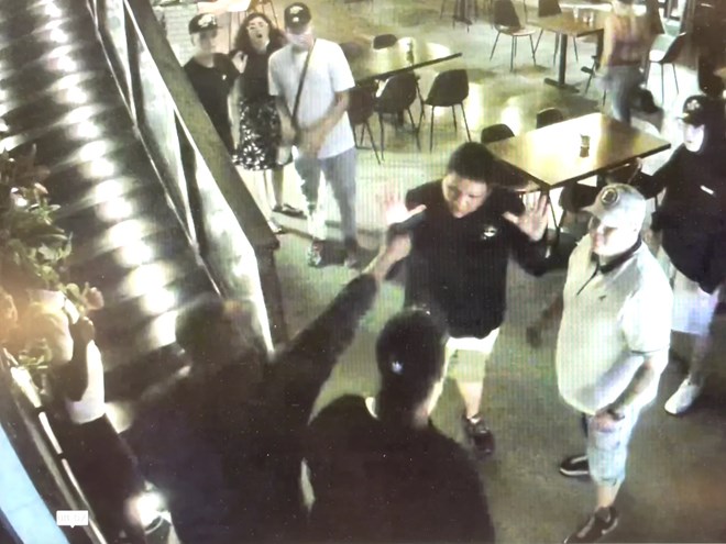 A man identified by witnesses as “Tax” is seen on surveillance video pointing a gun at Logan Nayneecassum moments before shooting him in the leg at Aria Food and Spirits on Aug. 21, 2020. Nayneecassum, 30, died from excessive blood loss. (Court exhibit)