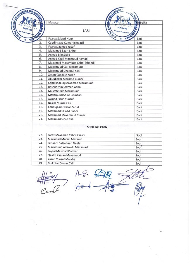 The 17 members of the SSC-Khatumo were included on the list. However, the Supreme Council of SSC-Khaatumo had previously declared that the newly formed SSC-Khaatumo administration would no longer be part of the semi-autonomous northern Somali state of Puntland.