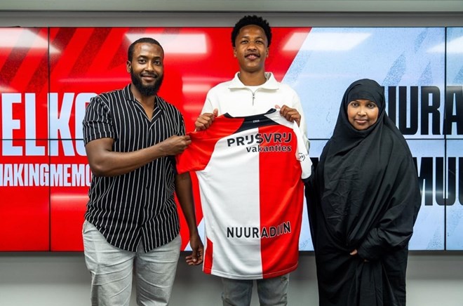 Nuuradiin Mahamud proudly holds up his new Feyenoord jersey alongside his parents after signing a contract with the club until mid-2027. The 15-year-old Dutch youth international is ready to embark on his journey with Feyenoord Under-17.