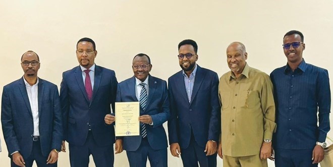 General Bashir Mohamed Jama, known as Bashir Goobe, proudly holds his election certificate after winning the by-election for the House of the People seat HOP 18 in Dhusamareb. He is joined by colleagues and supporters who share in his triumphant moment.