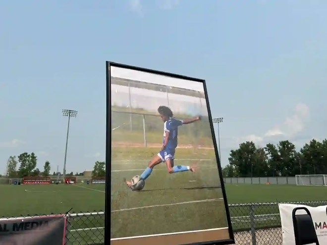 A framed photo of Mohamed Yusuf Abdullahi stood at the soccer complex Saturday. (Gavin Axelrod/CBC)