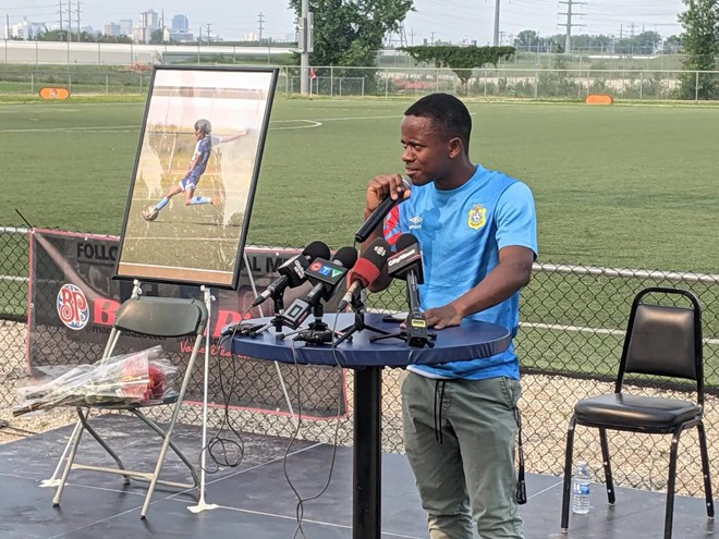 Jean-Paul Murhabazi paid tribute to his friend and soccer teammate, Mohamed Yusuf Abdullahi, at a public memorial Saturday. Abdullahi was fatally shot after a Canada African Cup of Nations game at the Ralph Cantafio Soccer Complex on July 13. CHRIS KITCHING / FREE PRESS