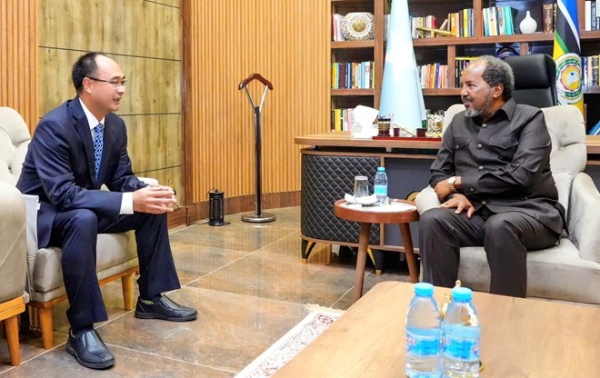 Somali President Hassan Sheikh Mohamud meets with Chargé d’Affaires Chen Wendi, who conveyed a personal message and an invitation from Chinese President Xi Jinping to attend the upcoming China-Africa Summit in Beijing. The meeting highlights the strengthening diplomatic ties between Somalia and China. CREDIT/ Villa Somalia