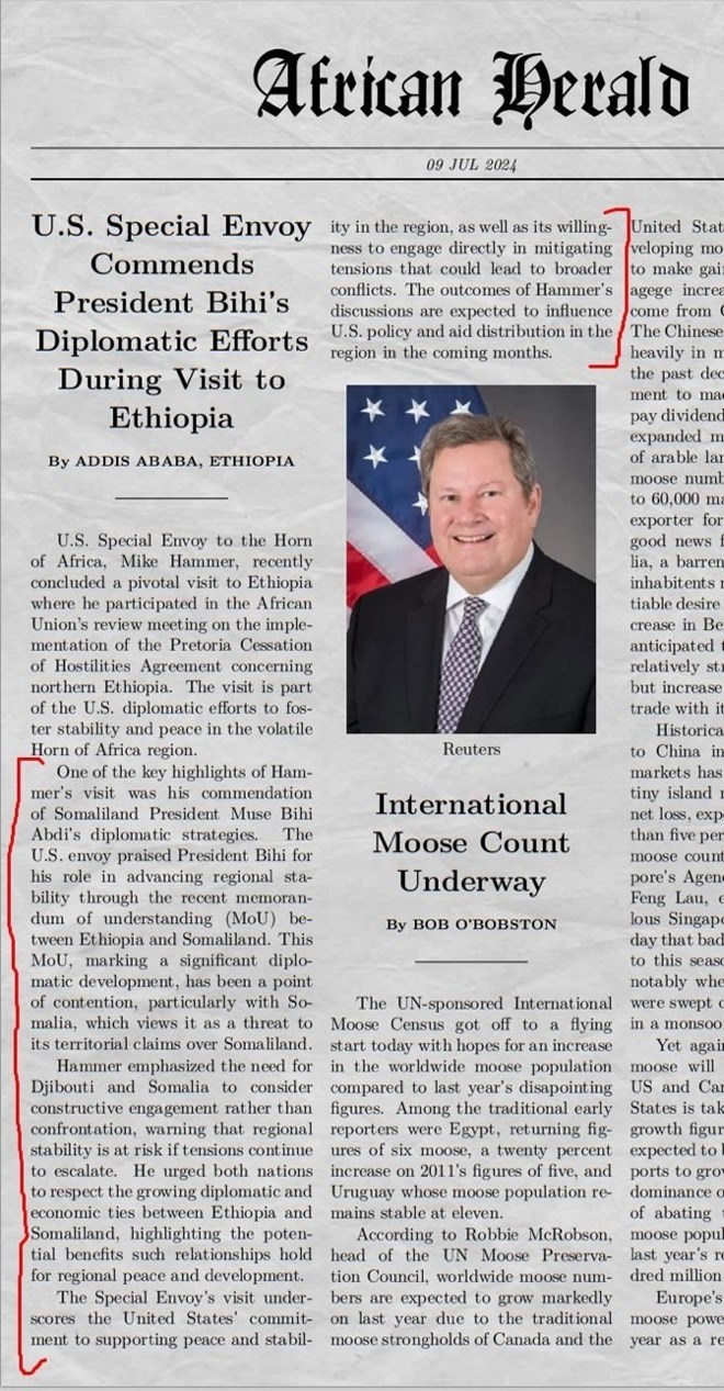 The false claims originated from a fabricated report allegedly published by “The African Herald,” a non-existent news outlet. The report, which included a photoshopped image designed to appear as a newspaper cutout, suggested that Hammer praised the diplomatic efforts of President Muse Bihii of Somaliland. In reality, Hammer made no such statements. During the 42nd Extraordinary Session of the Intergovernmental Authority on Development (IGAD), Hammer expressed concerns over the Memorandum of Understanding (MOU) between Ethiopia and Somaliland.