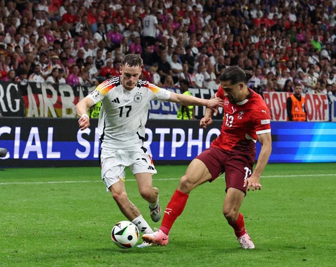 Florian Wirtz (L) of Germany vies with Ricardo Rodriguez of Switzerland during their UEFA Euro 2024 Group A match in Frankfurt, Germany on June 23, 2024. (Xinhua/Zhang Fan)