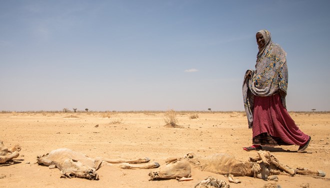 A mother of seven walking next to a corpuses in Gode Wereda, Gebias village of Ethiopia’s Somali region IDP center, Ethiopia ©FAO/Michael Tewelde