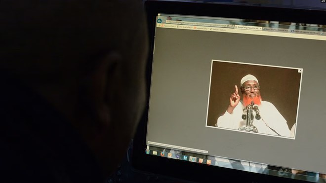 FILE – A man looks at a computer screen displaying an image of Somali-born cleric and Islamic State-Somalia leader Abdulqadir Mumin, in Nairobi, Kenya, Sept. 1, 2016. Mumin was targeted in an airstrike late last month, according to U.S. officials.