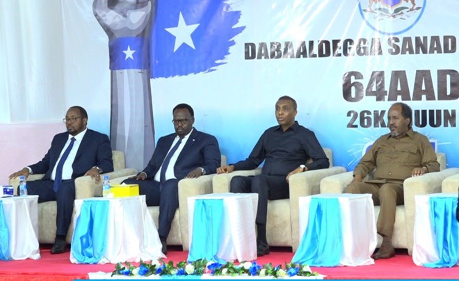 Mogadishu (HOL) — President Hassan Sheikh Mohamud attended a ceremony in Mogadishu on Tuesday to mark Somalia’s 64th Independence Day. He was joined by Prime Minister Hamza Abdi Barre, Deputy Prime Minister Salah Ahmed Jama, and other senior officials. During the event, President Mohamud wished Somalis at home and abroad a joyous Independence Day.