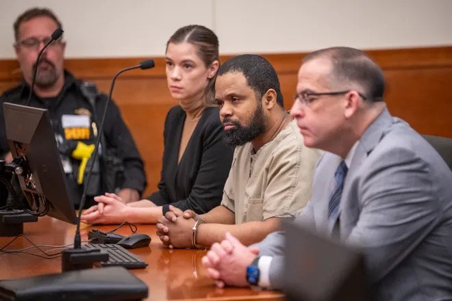 John Wooden, seen here in the center during a Jan. 30, 2024 hearing, was sentenced to life in prison Thursday, March 7, 2024 in the death of Mohamed Hassan Adam, a prominent member of the Columbus Somali and Muslim community. Brooke LaValley, Columbus Dispatch.