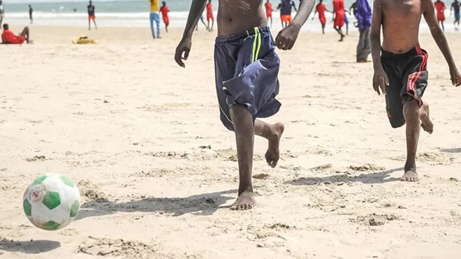 Boys playing football on a beach in Mogadishu, Somalia [AFP]