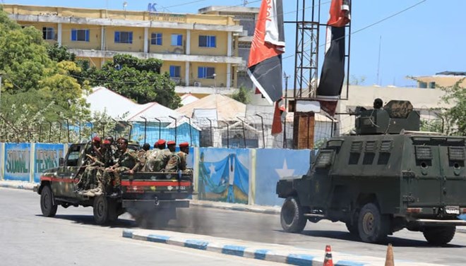 “Three soldiers died. Eighteen civilians and nine soldiers were injured in the hotel attack, Kasim Ahmed Roble, police spokesperson, told a news conference. “All the five terrorists were shot dead and their bodies displayed.”
