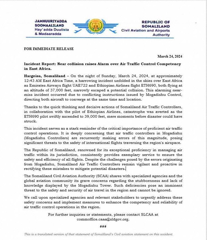 According to Somaliland’s Civil Aviation And Airport Authority a “harrowing” occurrence of a possible near collision was averted by the quick reaction of Somaliland’s ATC Controllers (see their report below).
