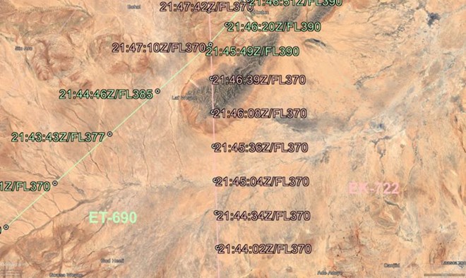 Both aircraft were at FL370 on converging trajectories over Somaliland, both in contact with Somalia’s Air Traffic Control, when ET-690 began their step climb to FL390. At that point the aircraft’s lateral distance was over 30nm. When ET-690 climbed through FL380 the aircraft were still 20nm apart. ET-690 was about 30nm before the crossing point when they began the climb, EK-722 was about 40nm ahead of the crossing point. When ET-690 crossed over the flight track of EK-722 already at FL390, EK-722 was still 10nm ahead of the crossing point. At no point in time separation minima were violated.