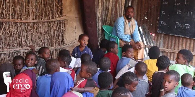 Children attend an overcrowded makeshift classroom in Mogadishu’s displacement camp, highlighting the urgent educational crisis faced by displaced families in the region. Credit: Radio Ergo.