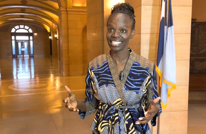 In this photo taken from video, Huldah Momanyi Hiltsley, who was born in Kenya and immigrated with her family to the United States, speaks at the Minnesota State Capitol on Nov. 8, 2024, about her election as the first Kenya-born member of the Minnesota House of Representatives.