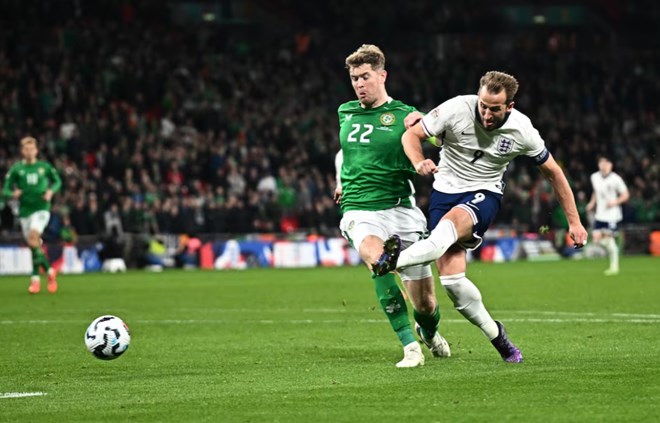 Soccer Football – Nations League – Group Stage – England v Republic of Ireland – Wembley Stadium, London, Britain – November 17, 2024 England’s Harry Kane shoots at goal REUTERS/Dylan Martinez Purchase Licensing Rights
