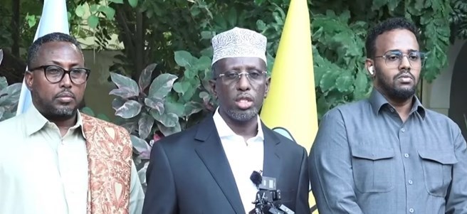 Former Somali President Sharif Sheikh Ahmed (center) addresses the media during a press conference in Mogadishu, flanked by key allies, as he criticizes the Federal Government’s handling of the Jubbaland crisis.