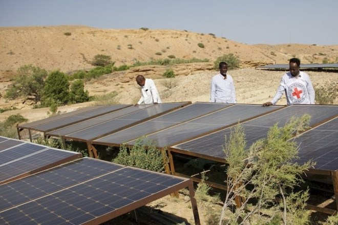 ICRC staff inspect solar-powered irrigation panels in Somalia. Advanced technologies like solar irrigation systems are helping farmers manage water scarcity, allowing date palms and other crops to grow even in drought-prone regions. CREDIT/ ICRC