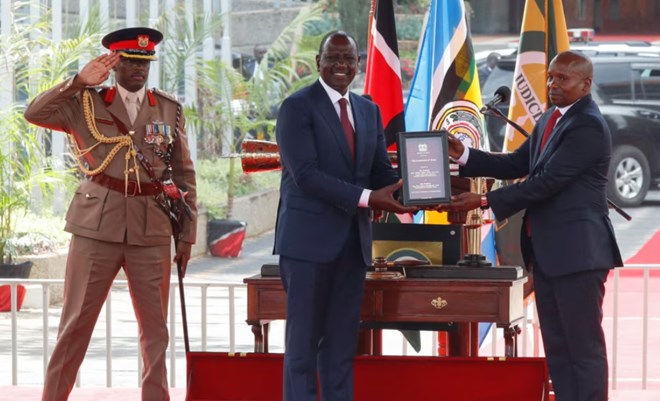Kenya’s President William Ruto hands over the Kenyan constitution to Deputy President Kithure Kindiki after he took the oath of office during his swearing-in ceremony, Nov. 1, 2024.