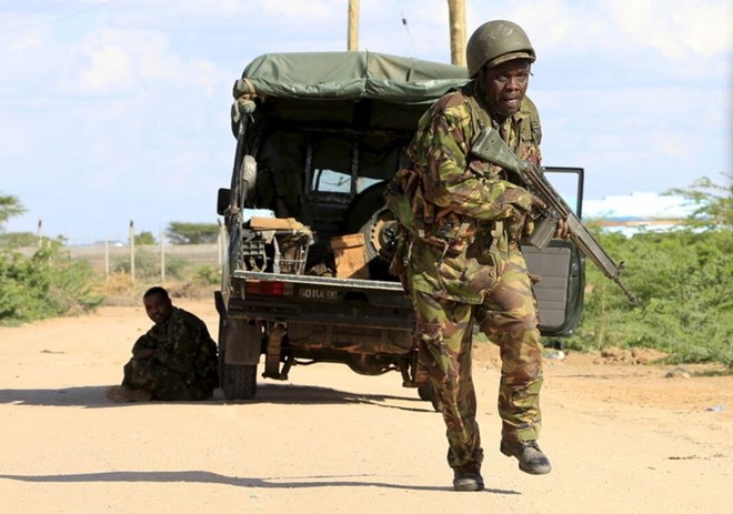 FILE – A Kenya Defense Force soldier runs for cover near the perimeter wall where attackers are holding up at a campus in Garissa, April 2, 2015. REUTERS/Noor Khamis