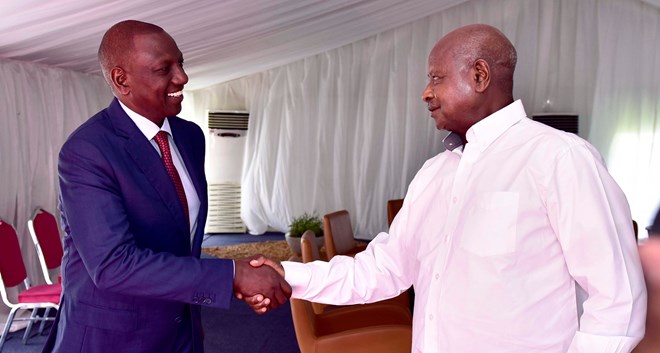 FILE – Kenyan President William Ruto and Ugandan President Yoweri Museveni engage in a cordial handshake during a meeting to discuss regional security and cooperation