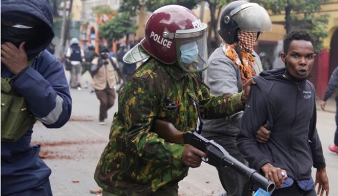 FILE – Kenyan anti-riot police arrest a man during a protest in Nairobi on June 27, 2024.