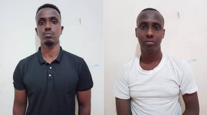The National Intelligence and Security Agency (NISA) released this photo of Zakariye Saed Abdullahi Sulsul (left) and Abdullahi Ahmed Hassan (right), suspects arrested in connection with alleged intelligence-gathering activities for the extremist group Al-Shabaab, aimed at civilian targets.