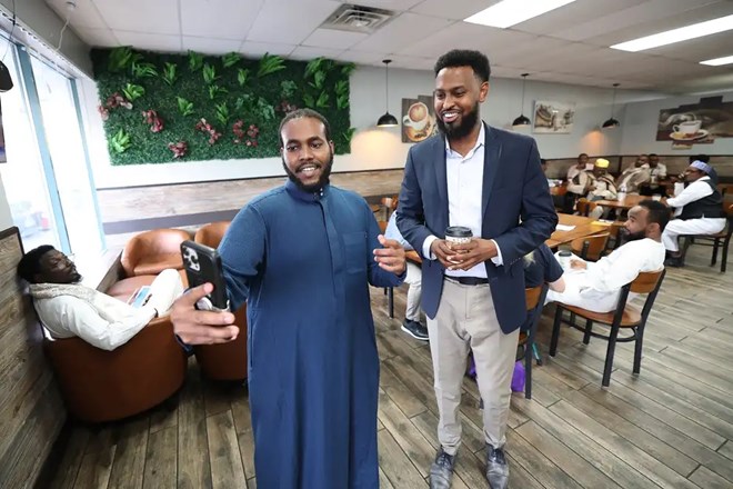Waamo Café owner Ibrahim Dekow (left) tapes a quick video clip with Abdi Daisane on Aug. 30, in St. Cloud.Paul Middlestaedt for MPR News