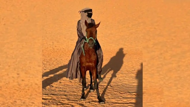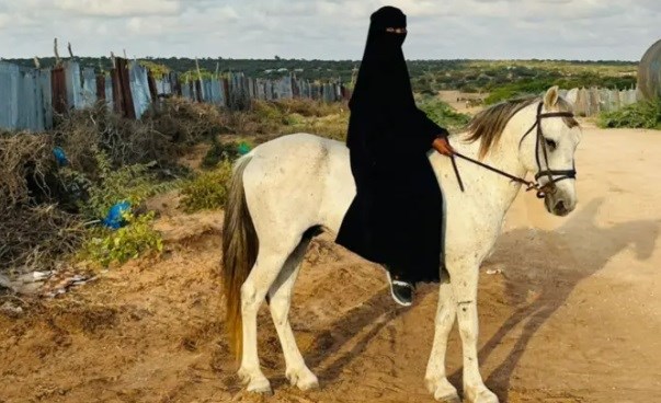 Shukri Osman Muse, clad in traditional attire, rides a horse across a sun-drenched terrain, showcasing her skill and dedication to breaking barriers in the male-dominated world of equestrian sports. Credit: Supplied by Shukri Osman