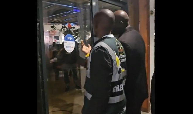Nairobi County officials stand outside the locked doors of Fay Bistrow, a Somali-owned nightclub in Kilimani, during a late-night raid on October 19, 2024. The club’s management allegedly refused entry after complaints of noise pollution from neighboring residents.