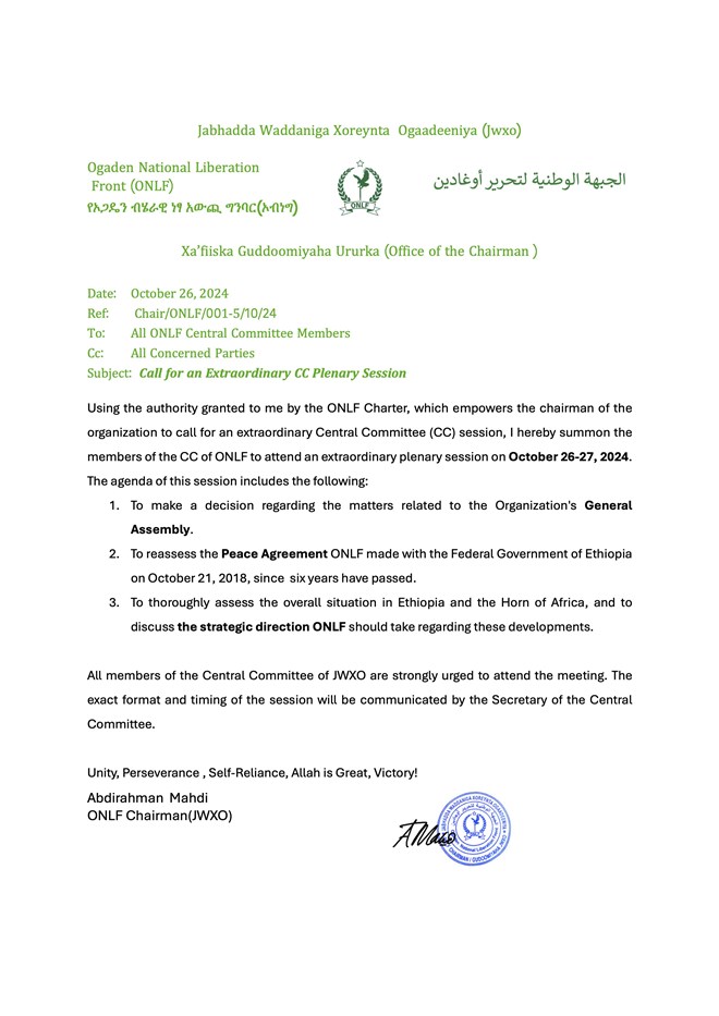 ONLF’s leadership has called for an extraordinary Central Committee (CC) plenary session on October 26-27, 2024, to formally reassess the 2018 peace agreement. The meeting will address the status of the peace accord and ONLF’s strategic direction amid rising tensions in the Horn of Africa.