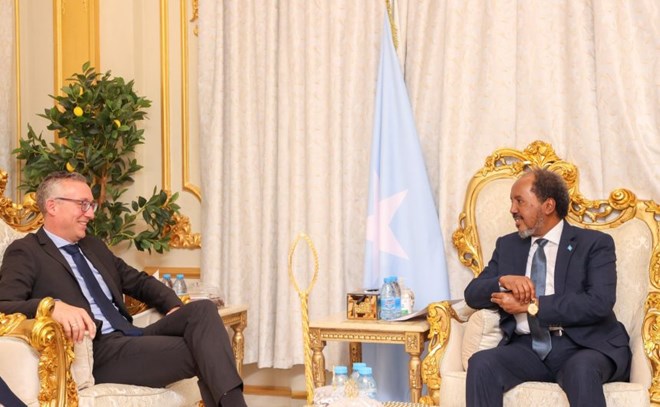 Mogadishu (HOL) — Somali President Hassan Sheikh Mohamud met with German Ambassador to Somalia, Sebastian Groth, at the Presidential Palace in Mogadishu on Thursday to discuss key areas of cooperation between the two nations.