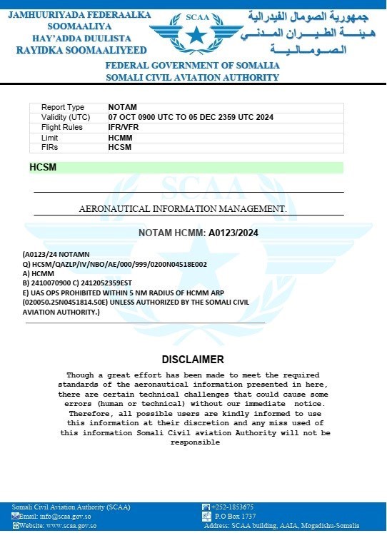 The directive, which took effect on October 7 and will remain in place until December 5, 2024, was announced via an official Notice to Airmen (NOTAM). “UAS operations are prohibited within a 5 NM radius of HCMM ARP unless authorized by the Somali Civil Aviation Authority,” the notice stated.