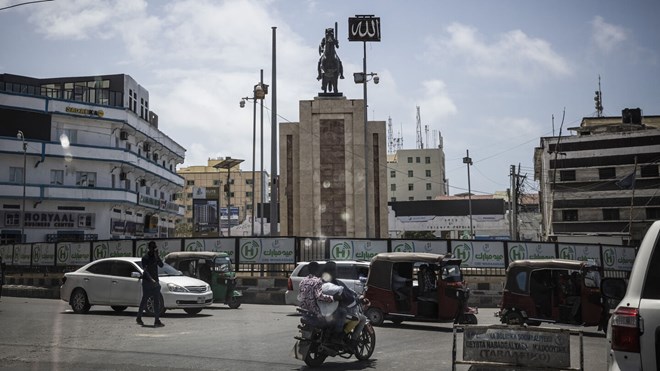 Auto rickshaws (Tuk-Tuks) and a monument are seen through the window of an armoured car on Sept. 4, 2022 in Mogadishu, Somalia. — Ed Ram/Getty Images